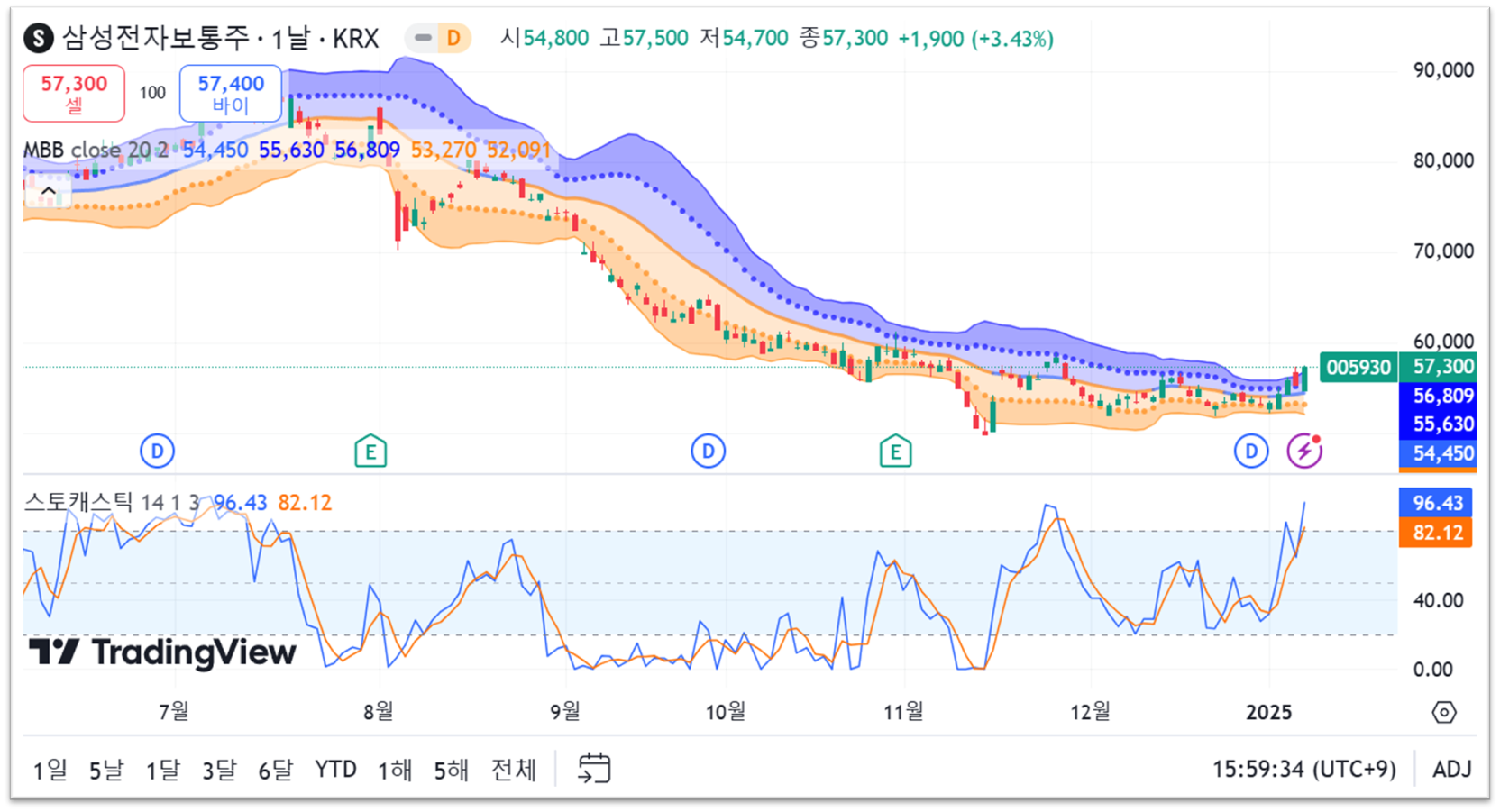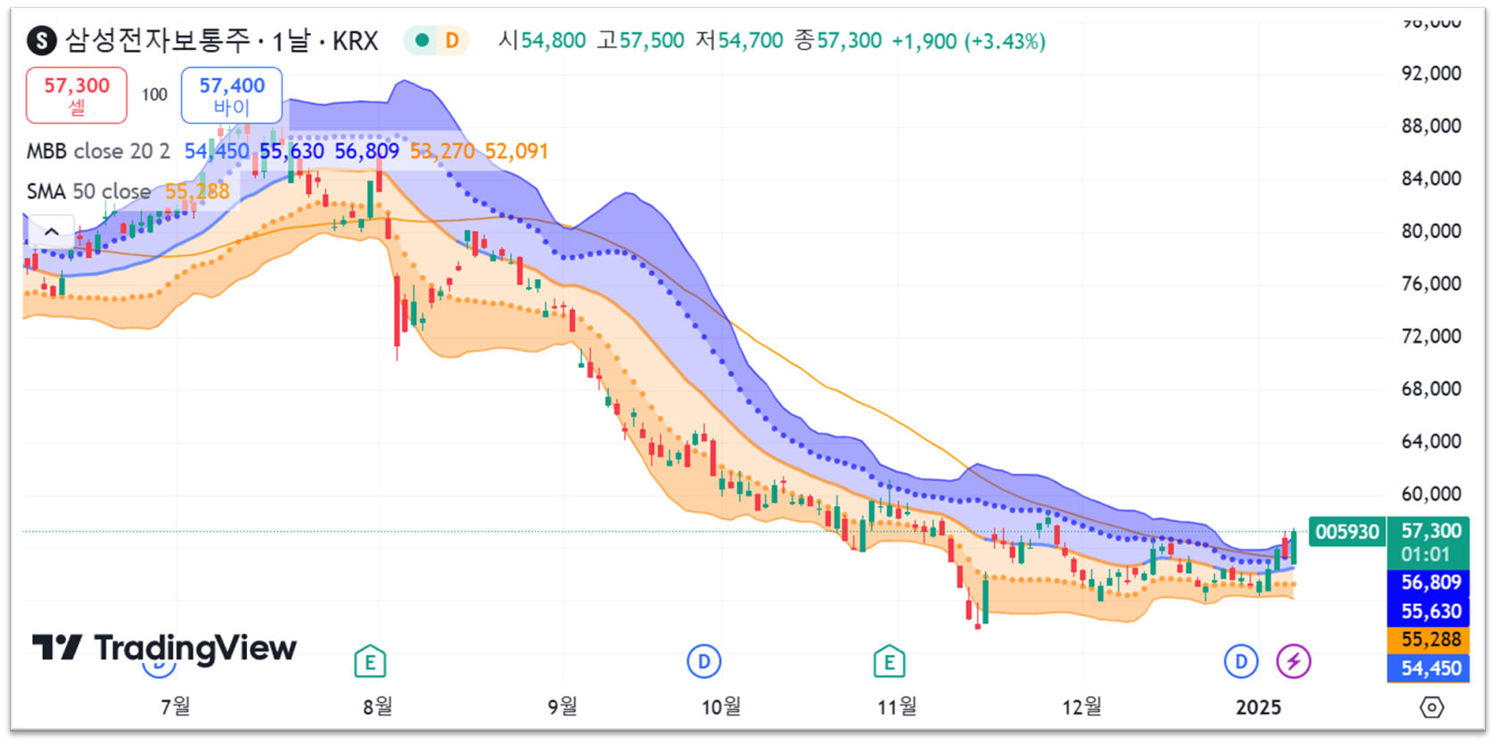 - 지지선: 볼린저 밴드의 중심선인 55,630원은 단기적인 지지선 역할을 할 수 있는데요, 만약 주가가 하락 조정받더라도 이 수준에서 반등할 가능성이 있습니다.