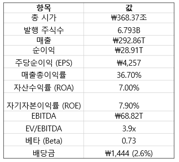 재무 건전성을 나타내는 주요 지표로는 자산수익률(ROA) 7.0%, 자기자본이익률(ROE) 7.9%가 있으며, EBITDA는 ₩68.82조로 견고한 수익성을 보여주고 있습니다. EV/EBITDA는 3.9배로 합리적인 수준이며, 베타 값은 0.73으로 시장 변동성 대비 안정적인 모습을 보이고 있습니다. 배당금은 ₩1,444로, 배당수익률은 2.6%를 유지하며 투자자들에게 안정적인 배당 수익을 제공하고 있습니다.