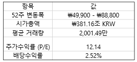 52주 동안의 최저가는 ₩49,900, 최고가는 ₩88,800였는데요, 시가총액은 ₩381.16조에 달하며, 평균 거래량은 2,001.49만 주로 안정적인 유동성을 보이고 있습니다. 현재 주가수익률(P/E)은 12.14로 평가되고 있으며, 배당수익률은 2.52%로 투자자들에게 매력적인 배당을 제공하고 있습니다.
