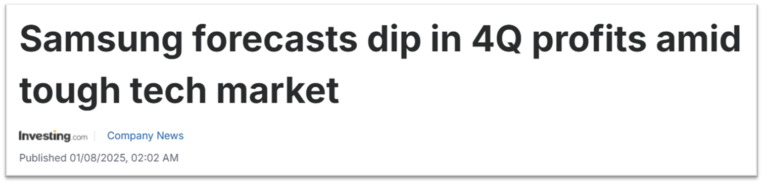 삼성전자는 2024년 4분기 잠정 영업이익을 6.5조 원(약 4.5억 달러)으로 발표했으며, 이는 시장 예상치인 8.96조 원을 크게 밑돌았는데요, 이는 다음과 같은 이유로 분석됩니다