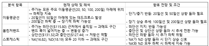 현재 주가는 하단선인 $115.80대에서 움직이고 있는데요, 지지 여부가 중요하며, 하단선을 지지하고 반등한다면 단기적 상승 가능성이 있어 보입니다. 만약 하단선을 하향 돌파한다면 추가 하락의 위험이 있으니 유의해야 합니다.