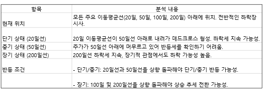 특히 20일 이동평균선이 50일 이동평균선 아래에 있는 데드크로스 상태로, 하락세가 계속되고 있습니다.