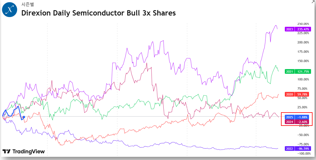 SOXL은 연도별로 극단적인 성과를 보여주며, 투자자들에게 기회와 위험을 동시에 제공했습니다.