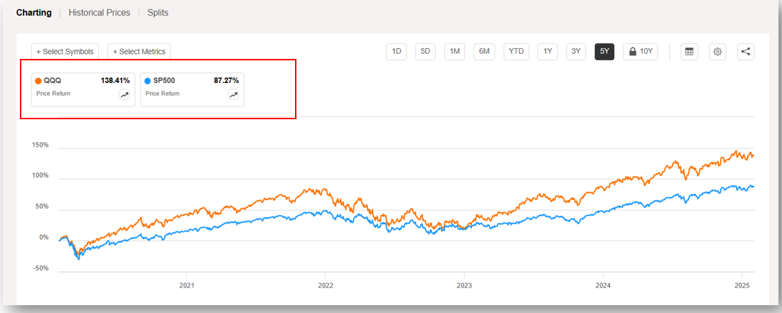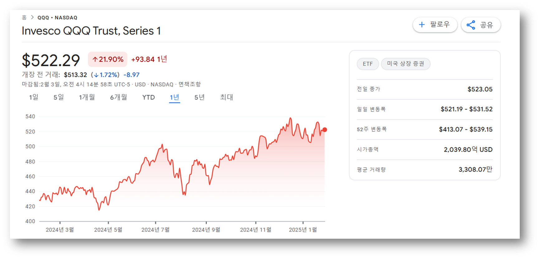 📈 장기적으로 QQQ는 꾸준한 성장세를 보이며, 기술주 상승기에 강력한 상승세를 보여주는데요, 최근 5년 주가 트렌드를 살펴볼까요?