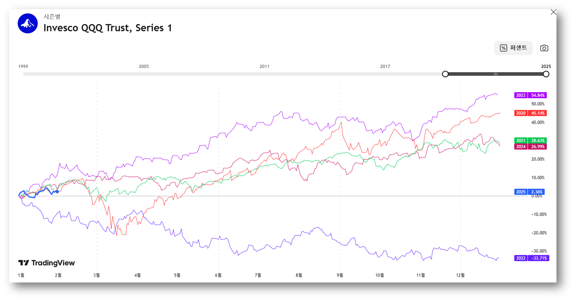 - 2023년: +54.84% (기술주 강세장)