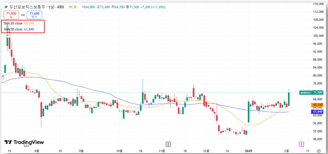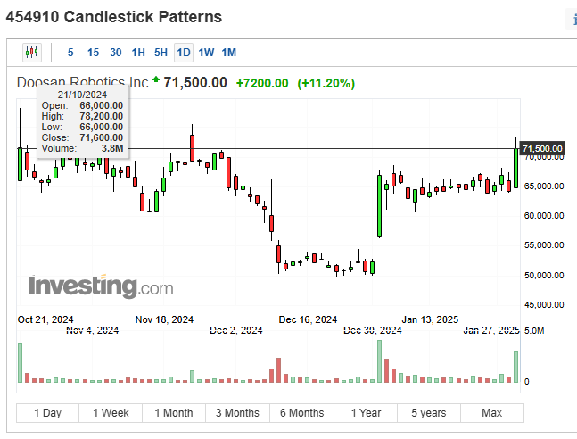 최근 두산로보틱스는 AI 로봇 산업과 관련된 긍정적인 뉴스와 함께 주가가 급등세를 보이고 있습니다. 2025년 2월 4일, 주가는 71,500원(+11.20%)으로 상승하며 올해 첫 7만 원 돌파에 성공했습니다. 이번 글에서는 두산로보틱스의 주가 동향, 전망, 목표주가에 대해 자세히 알아보겠습니다.