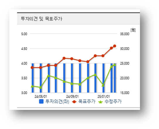 증권가 평균 목표주가 30,833원으로 현재 주가 대비 12% 이상의 상승 여력이 있는 것으로 평가됩니다.