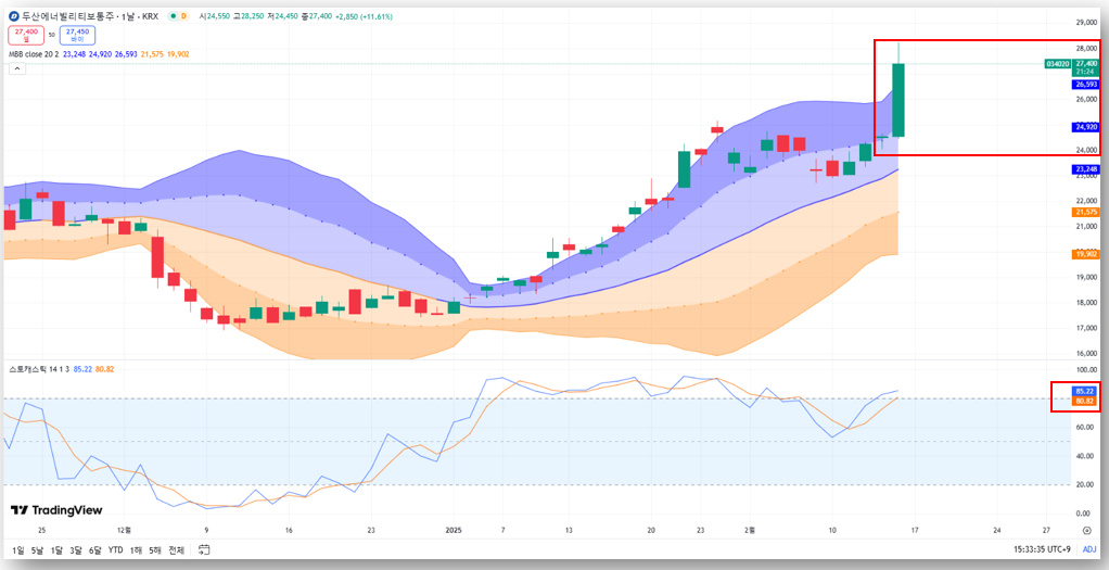 - 단기 과열: 볼린저밴드 상단 돌파, 스토캐스틱 과매수 진입