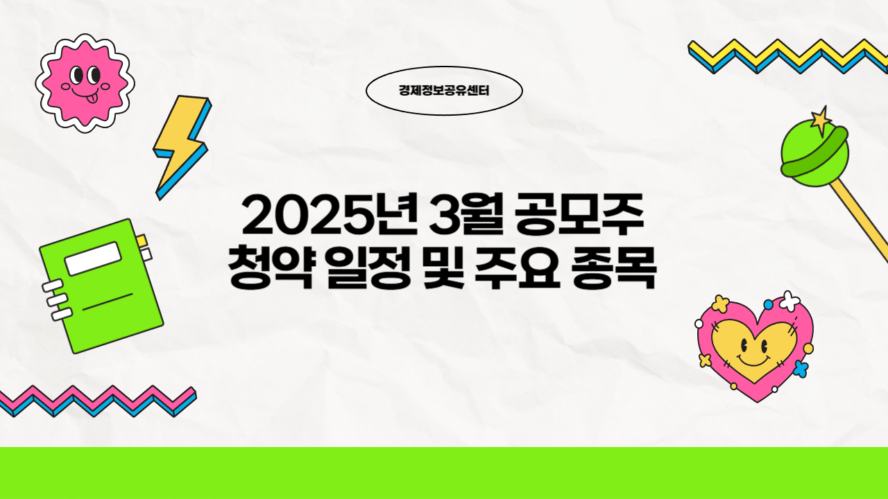 2025년 3월에는 다양한 공모주 청약 일정이 예정되어 있으며, 투자자들의 관심이 높은 종목들이 다수 포함되어 있는데요, 이번 포스팅에서는 3월 공모주 청약 일정과 함께 주요 종목들의 공모가, 경쟁률, 주관사 등을 정리해보겠습니다.