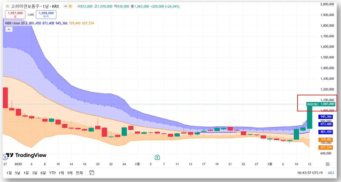 - 볼린저밴드 상단(945,366원) 돌파! 추가 상승 가능성 존재