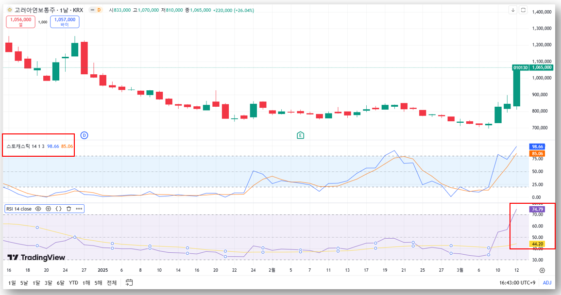 - RSI(74.79) & 스토캐스틱(98.66) → 과매수 구간 진입