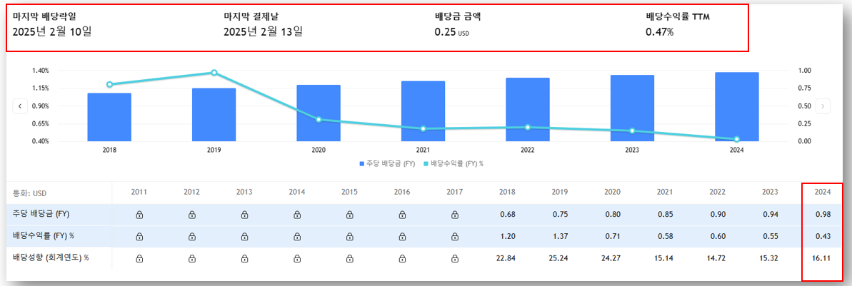 • Q1 2025 예상 EPS: 2.40달러 (전년 대비 +6.66%)