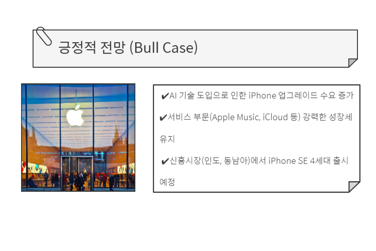 서비스 부문과 AI 기술 도입이 주요 성장 동력이 될 전망이며, 아이폰 16 출시가 향후 주가 회복에 중요한 역할을 할 것으로 보입니다.