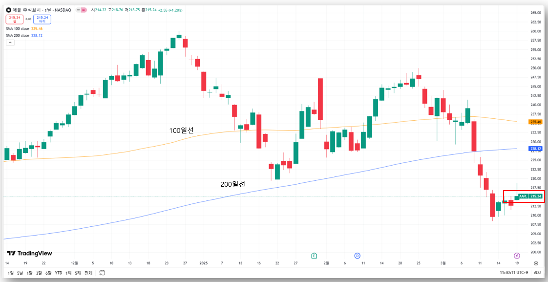 • 100일선(235.46달러), 200일선(228.12달러) 역시 현재 주가보다 높은 위치