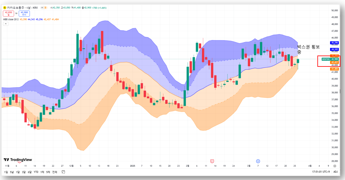 - 📌 볼린저밴드 기준 박스권 횡보 중, 거래량 증가 시 돌파 가능성