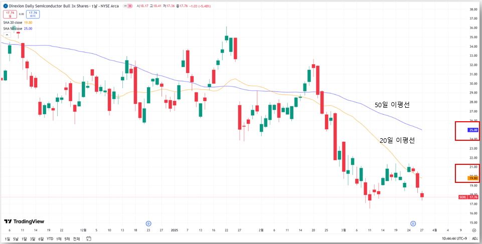 현재 SOXL은 단기적으로 과매도 구간에 진입해 있으나, 추세 반전 신호는 아직 부족한 상황입니다. 고위험 고수익을 노리는 투자자라면 분할 매수 전략을 고려해볼 수 있겠지만, 철저한 리스크 관리가 필수입니다.