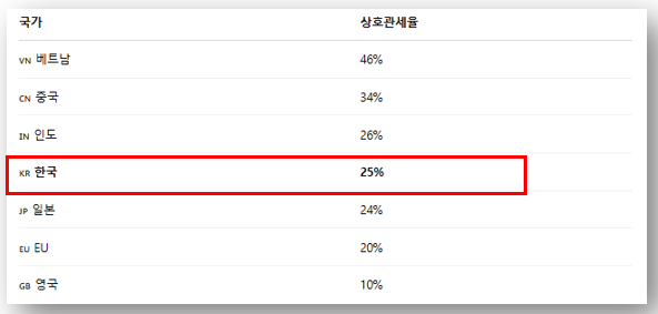 고 발언하며 한국 제품에 대해 25%의 상호관세를 부과한다고 발표했습니다.