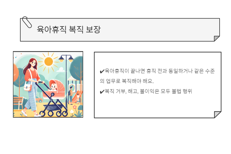 - 육아휴직이 끝나면 휴직 전과 동일하거나 같은 수준의 업무로 복직해야 해요.