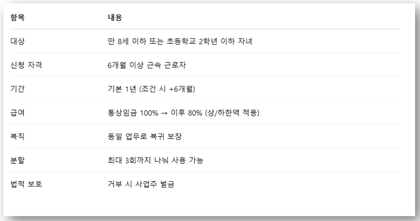 근로자의 신분은 유지되며, 복직도 법적으로 보장돼 있어 경력단절 예방에도 매우 중요한 제도죠.