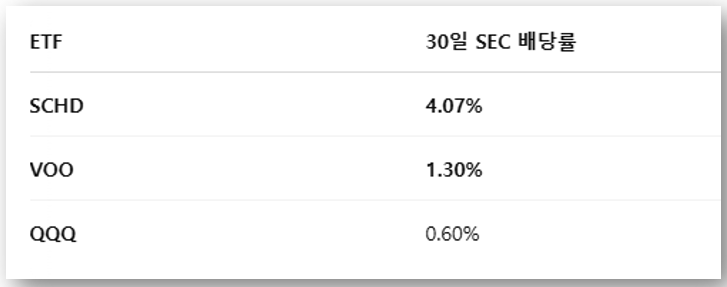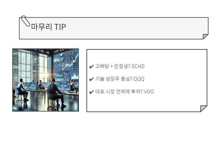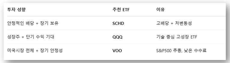 고배당 ETF인 SCHD, 기술 중심 성장형 ETF QQQ, 미국 대표 대형주 지수 추종 ETF인 VOO(S&P500).