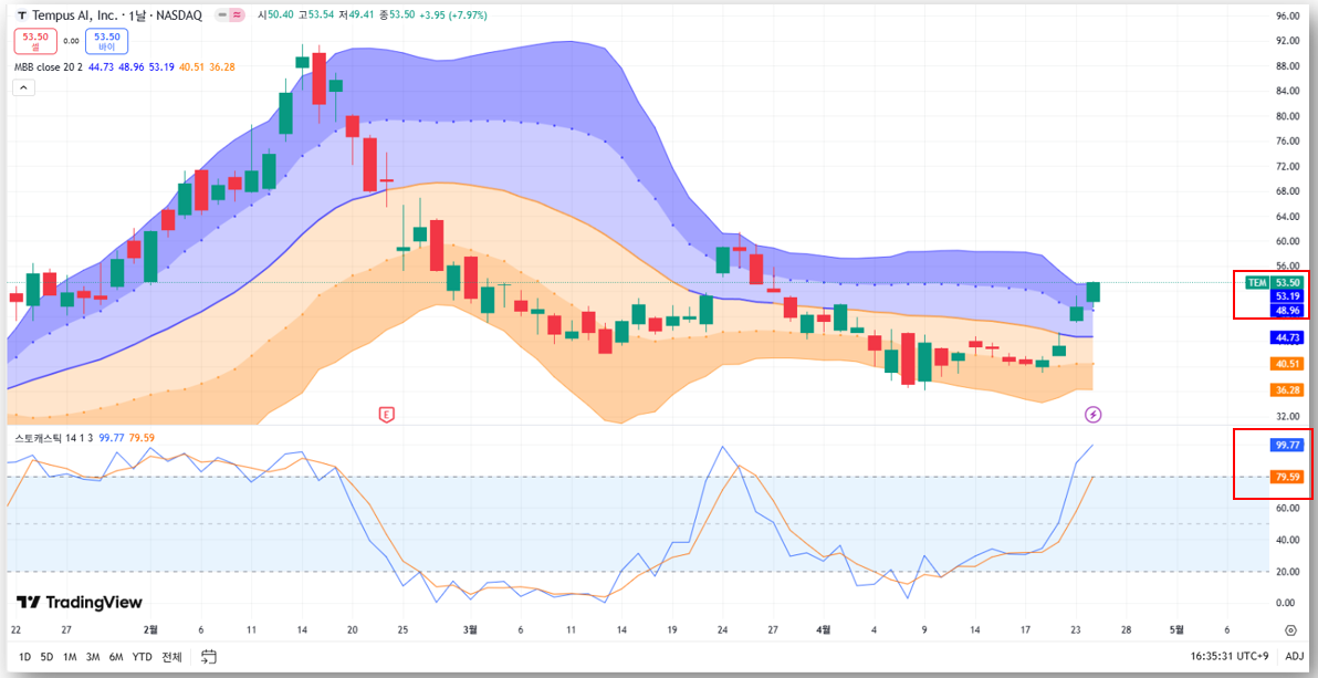 - 볼린저 밴드 상단 돌파 및 스토캐스틱 지표 과매수 영역 진입 (99.77)