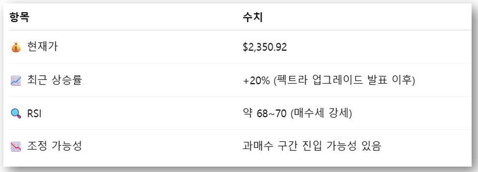 🔥 이더리움은 2025년 5월 초 'Pectra' 업그레이드를 통해 네트워크 속도, 수수료 효율, 보안성 모두를 개선하며 급등했습니다. 기술 호재가 투자심리에 긍정적 영향을 주고 있습니다.