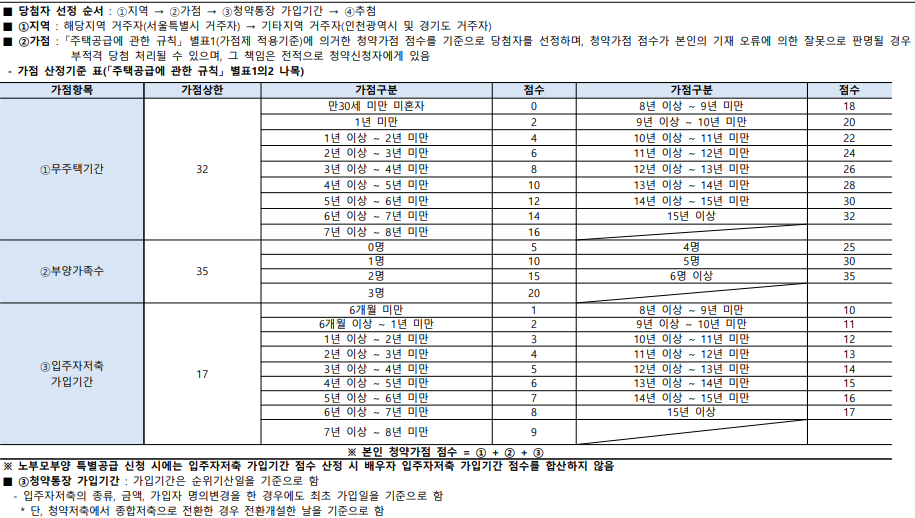 - 가점항목: 미성년 자녀 수 + 입주자저축 가입기간 + 무주택기간