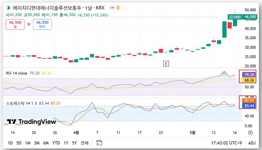 - RSI(79.20), 스토캐스틱(87.51) 등 과매수권 진입