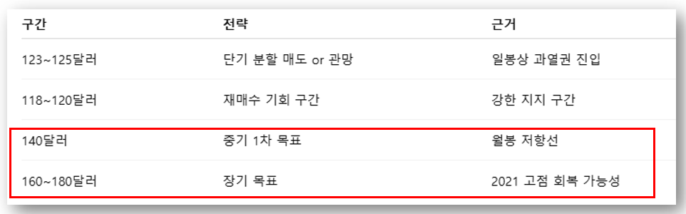 - 눌림 시 118~120달러 지지 여부 확인 필요