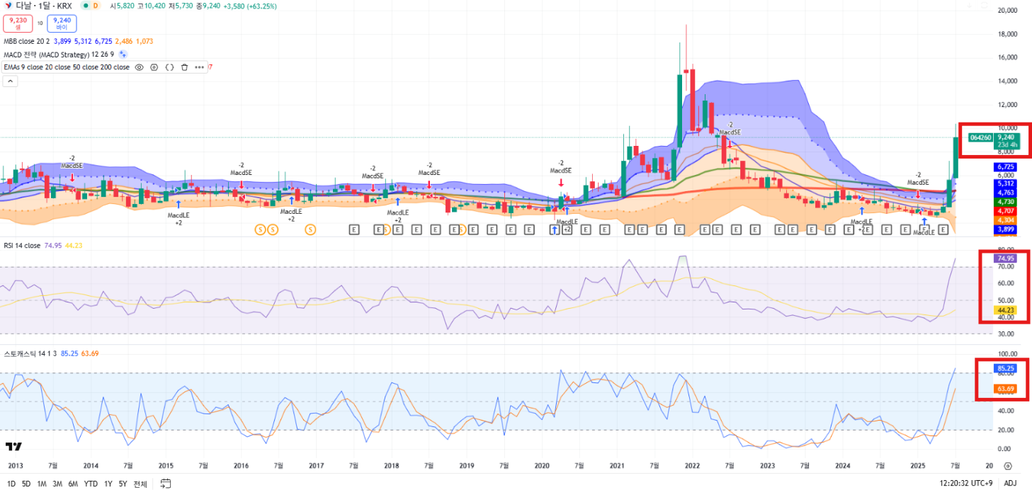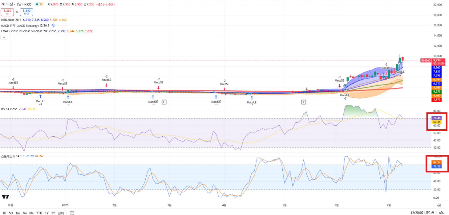- 스토캐스틱: 고점 신호 → 단기 조정 가능성