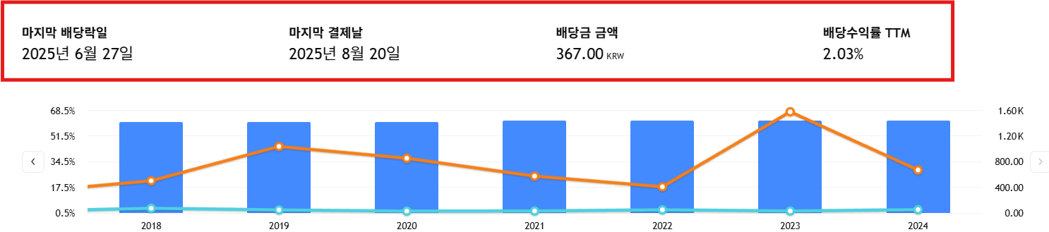 - 연간 배당금 : 1,452원 (분기 363~367원)