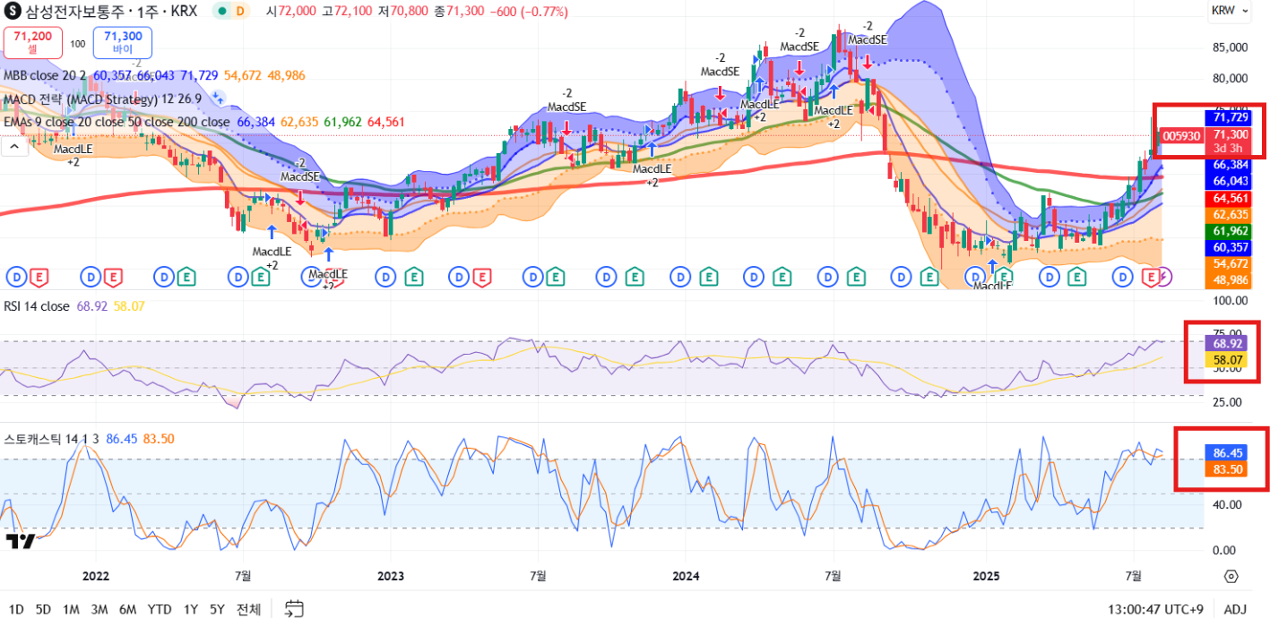 현재 중립~과매수 구간으로 7만원을 지지하고 있으며, 단기 저항선은 볼린저밴드 상단 부분인 73,500원입니다. 7만원 부근까지 조정이 오면 담아가는 전략이 유효해보여요!