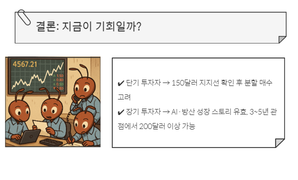 ✔️ 장기 투자자 → AI·방산 성장 스토리 유효, 3~5년 관점에서 200달러 이상 가능