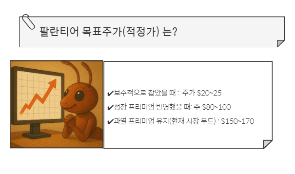 - 보수적 관점에서 PER를 50배로 잡았을 때는 최대 42.5달러 정도로 보여요. 지금 현재 주가에 비해 매우 낮습니다. 팔란티어는 현재 주가가 미래의 가치가 많이 선반영 되어 있어서 보수적 관점에서 주가를 계산하기는 적절치 않은 거 같아요.