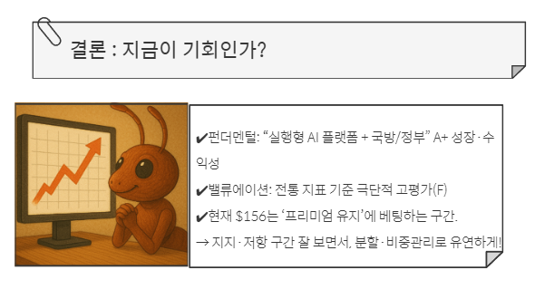 - 펀더멘털: “실행형 AI 플랫폼 + 국방/정부” A+ 성장·수익성