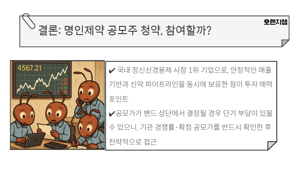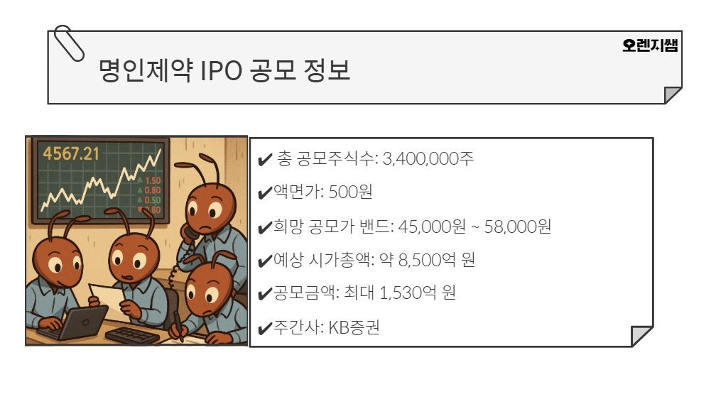 이번 포스팅에서는 명인제약의 기업 개요, 청약 공모 정보, 투자 포인트와 리스크, 청약 일정에 대해 알아볼테니, 참고바래요!