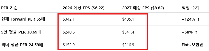 AMD의 2026년 예상 EPS인 6.22달러와 2027년 예상 EPS인 8.82달러로 한번 적정주가를 추산해볼게요!