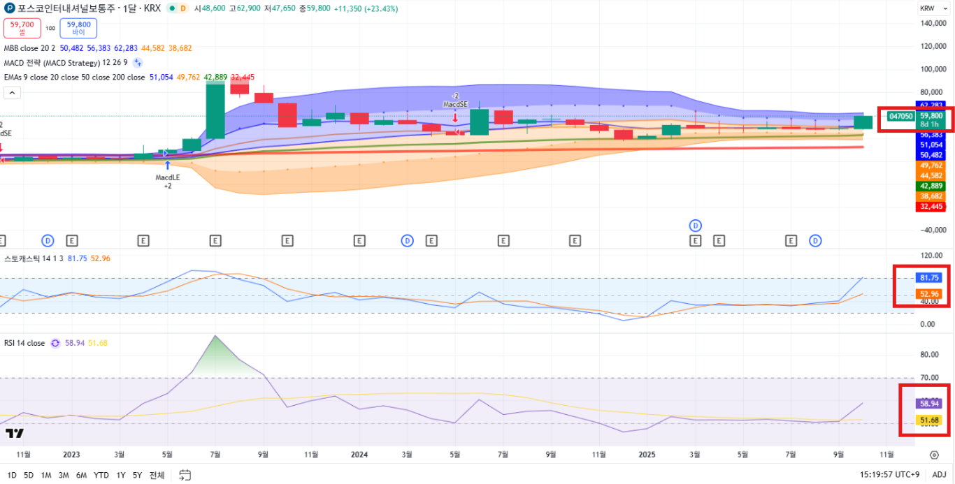 포스코인터내셔널이 장중 +12.85% 상승, 6만 원대를 돌파하며 시장의 관심을 집중시켰는데요, 지금 현재는 59,900원에 거래 중이에요.10월 초 대비 약 23% 이상 급등이 나왔고, 기술적 지표상으로도 RSI 80 돌파, 스토캐스틱 과매수 구간 진입 등 강한 매수세가 확인되고 있는데요,