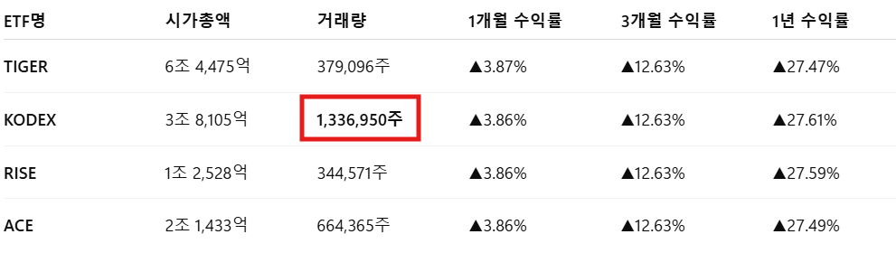 거래량은 KODEX가 가장 많습니다.