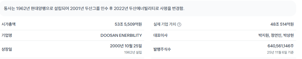 • 설립: 1962년 현대양행 → 2001년 두산 인수 → 2022년 사명 변경
