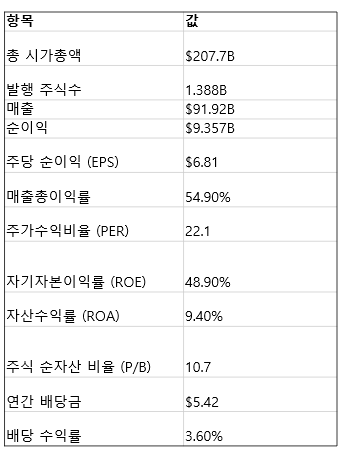 • 주당 순이익 (EPS) : $6.71👉 1주당 이익을 얼마나 창출했는지 보여주는 지표로 높은 수준임