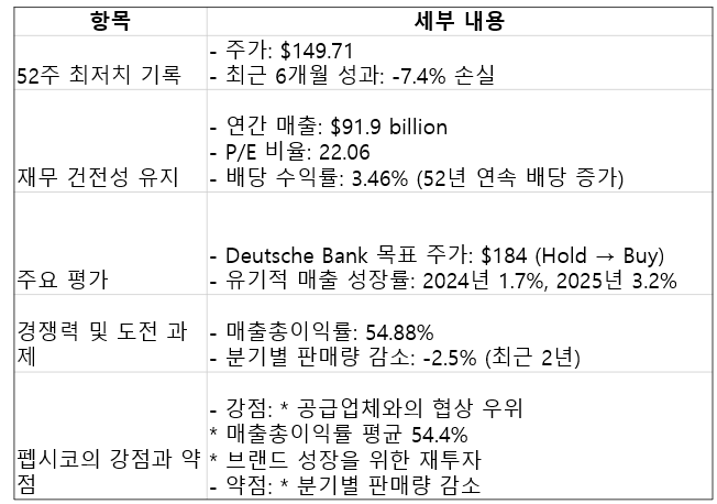 펩시코 주식은 최근 $149.71로 52주 최저치를 기록했는데요. 최근 6개월 동안 -7.4% 손실을 기록하며 S&P 500의 6.4% 상승률과 대조적인 성과를 보였습니다.