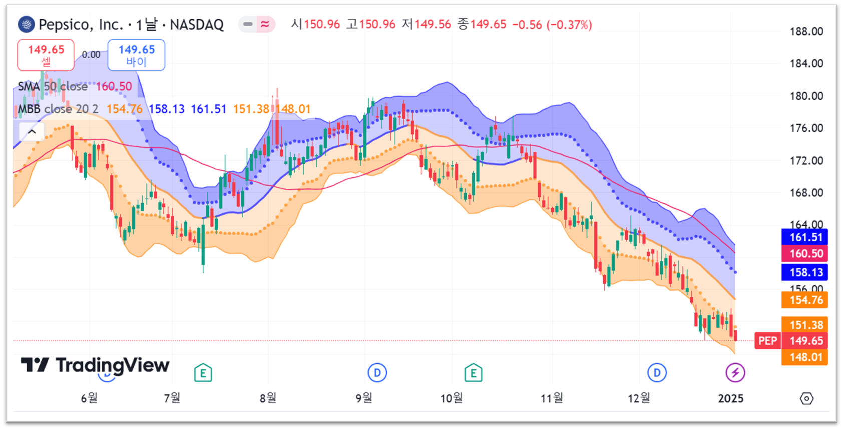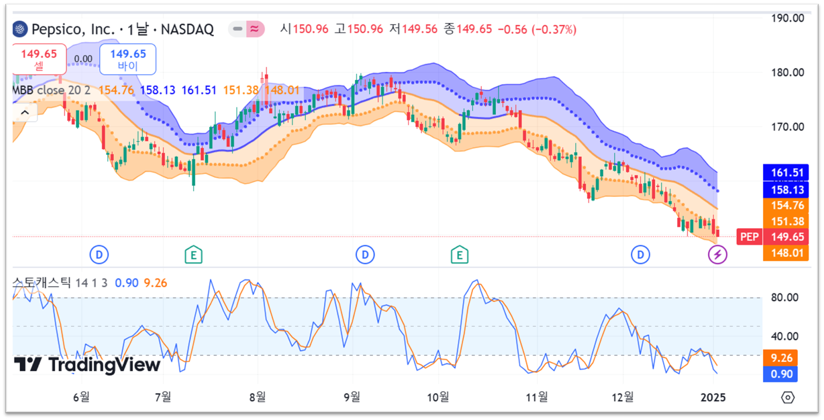 안녕하세요? 기술주 빅테크 중심으로 최근 급격한 성장을 하고 있는 가운데, 고배당주 가치주인 펩시콜라의 주가는 하락하고 있는데요, 특히 펩시콜라는 52주 최저치인 149.65를 기록하고 있습니다. 매도세가 강해지는 가운데, 더 하락할 것인지 지금이 매수 시점인지에 대해 알아보도록 하겠습니다.
