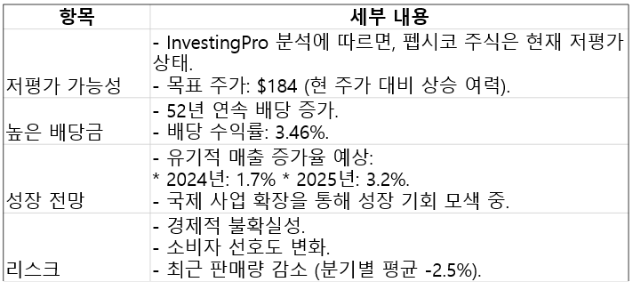 Deutsche Bank는 펩시코의 목표 주가를 $184로 상향 조정하며, 투자 의견을 Hold에서 Buy로 변경했는데요, 이러한 목표 주가는 장기 투자의 관점에서 볼 때에 매수해야 할 때임을 보여줍니다. Jefferies, HSBC, JP모건, Wells Fargo 등의 분석가들도 긍정적 전망을 유지하고 있으며, 유기적 매출 성장률은 2024년에 1.7%, 2025년에 3.2%로 전망하고 있습니다.