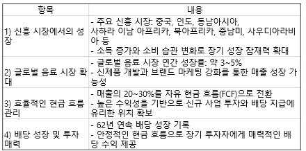 - 글로벌 음료 시장은 연간 약 3~5%의 꾸준한 성장을 보이며, 코카콜라에게는 지속적인 성장 기회를 제공하고 있습니다. 특히, 신제품 개발과 브랜드 마케팅 강화는 매출 확대에 기여할 것으로 보입니다.