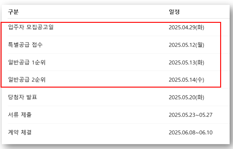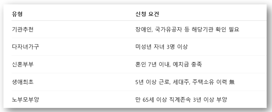 - 특별공급은 기관추천, 다자녀가구, 신혼부부, 생애최초 등 조건별 해당자만 신청 가능