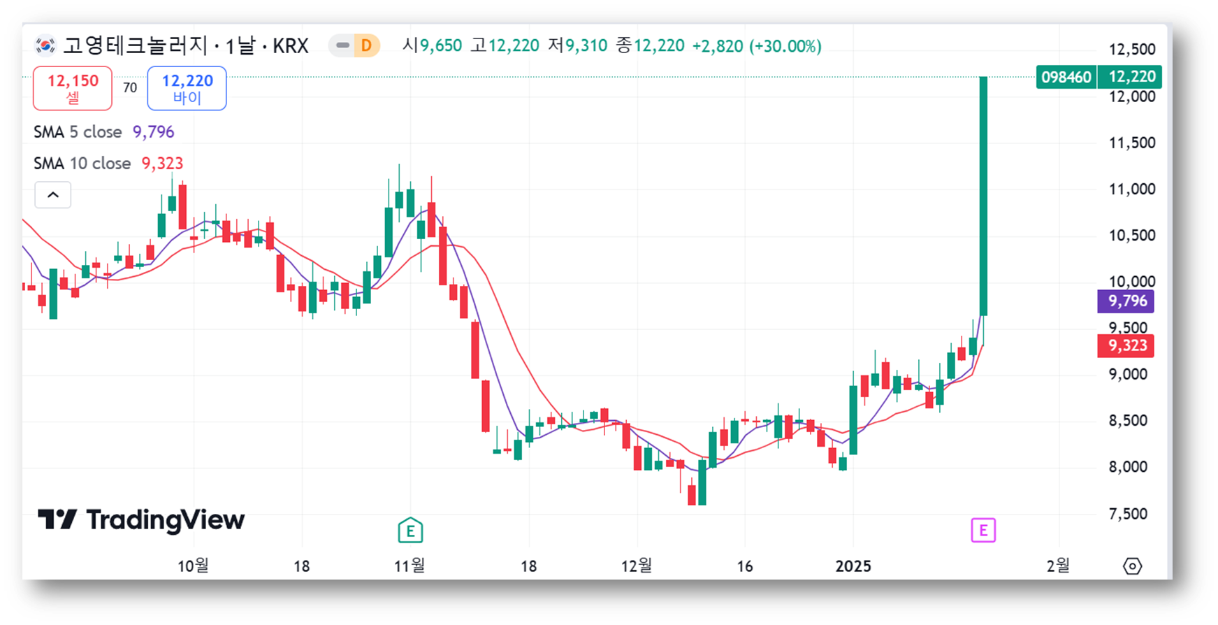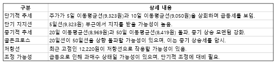 현재 주가는 급등하며 과매수 구간에 도달했을 가능성이 크며, 단기적으로 조정이 일어날 수 있어 보이는데요, 지지선은 5일선(9,323원), 저항선은 최근 고점 부근인 12,220원으로 보입니다.