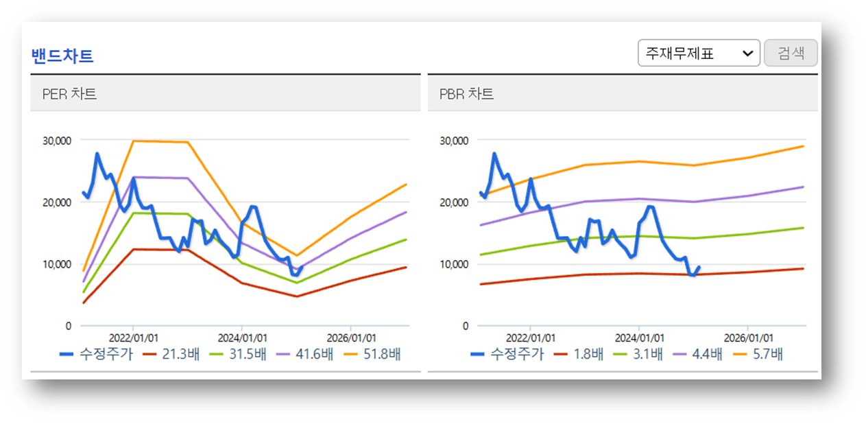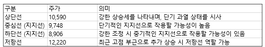 - 지지선: 중심선(9,748원) 부근이 단기적인 지지선으로 작용할 가능성이 높습니다. 주가가 조정을 받더라도 이 구간에서 지지를 받을 가능성이 커 보입니다. 만약 강한 조정이 일어난다면, 하단선(8,906원) 부근이 중기적인 지지선으로 작용할 가능성이 있습니다.