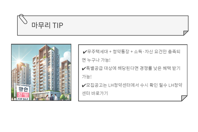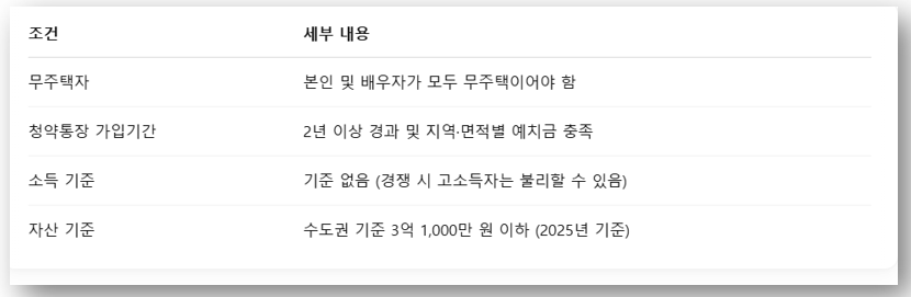 - ✅ 무주택세대 + 청약통장 + 소득·자산 요건만 충족되면 누구나 가능!