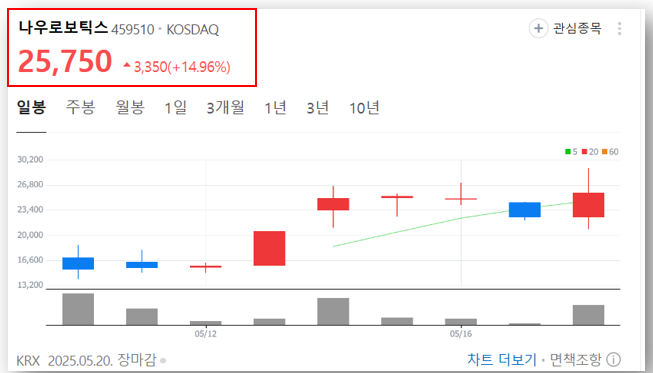 - 5월 20일 기준: 종가 25,750원, 전일 대비 +14.96%